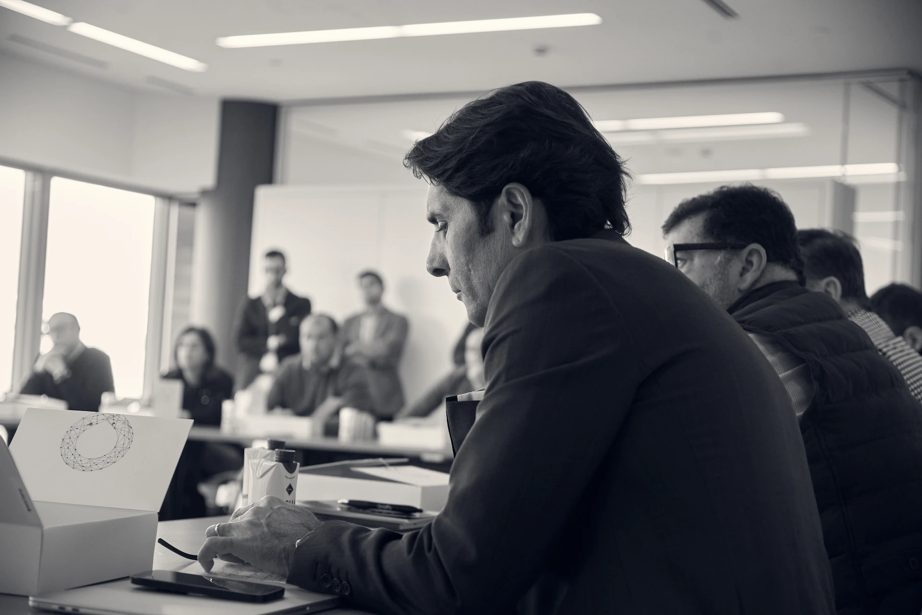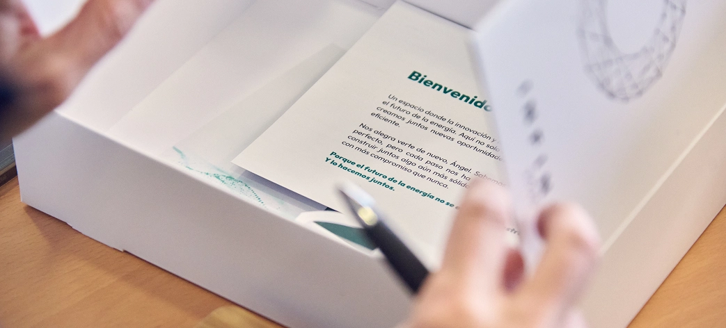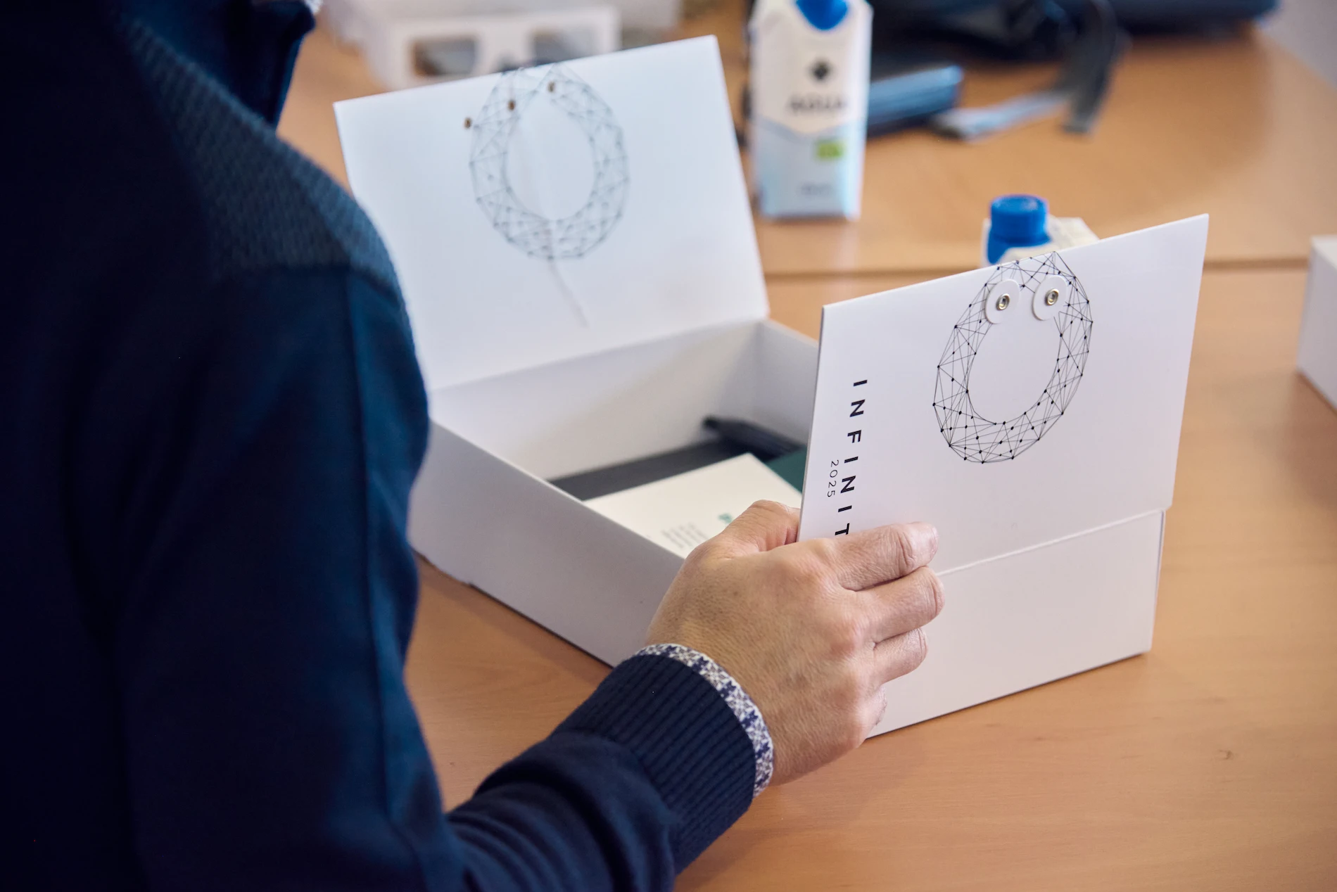 Desde el primer momento, quisimos que cada detalle reflejara esta visión de Infinity: el futuro de la red lo construimos entre todos. Al entrar en la sala, cada asistente encontró en su sitio una caja de cartón blanca personalizada con el símbolo de Infinity. Dentro, un cuaderno y un bolígrafo para anotar ideas, tarjetas que utilizaríamos a lo largo del CAB y un elemento especial: unas gafas que simulaban una realidad virtual.